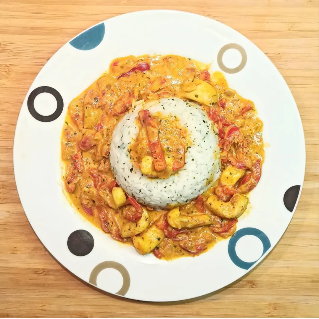 - A la fin de cuisson, ajouter la crème. Dresser en parsemant de coriandre fraîche.