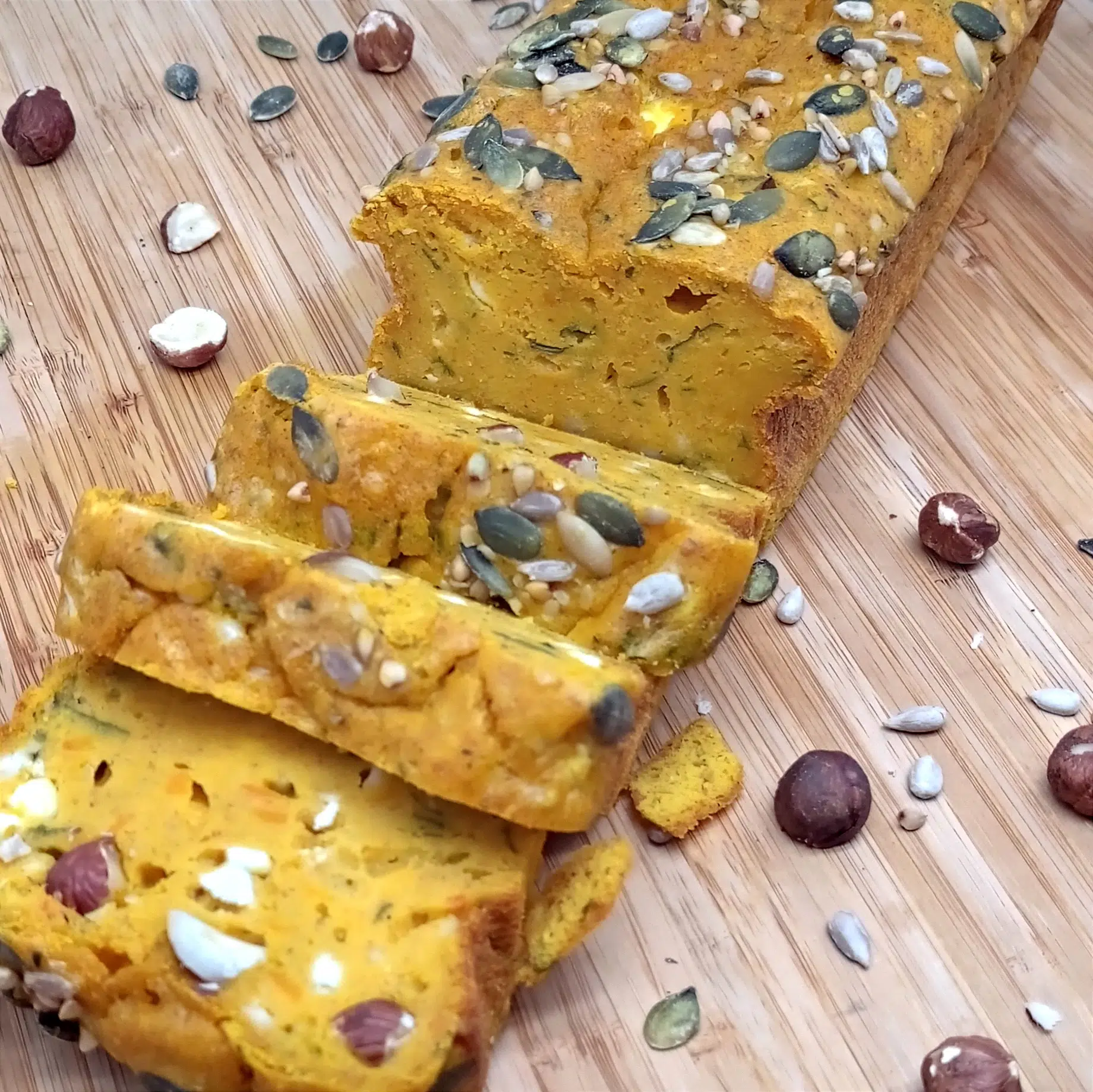 - Mettre le four à préchauffer à 180°-210C (thermostat 6-7).Pendant ce temps, mélanger la farine et la levure. Ajouter l'ensemble des autres ingrédients en prenant soin d'émietter la féta, de ciseler le basilic frais et de concasser les noisettes. Garder les graines pour décorer le cake sur le dessus avant cuisson. Mélanger l'ensemble et ajouter 200 à 250g de potimarron cuit (suivant la texture du cake que vous souhaitez obtenir). Bien mélanger et verser dans un moule à cake préalablement chemisé. Décorer avec les graines et enfourner pour 45 minutes à 180-210°C (thermostat 6-7).