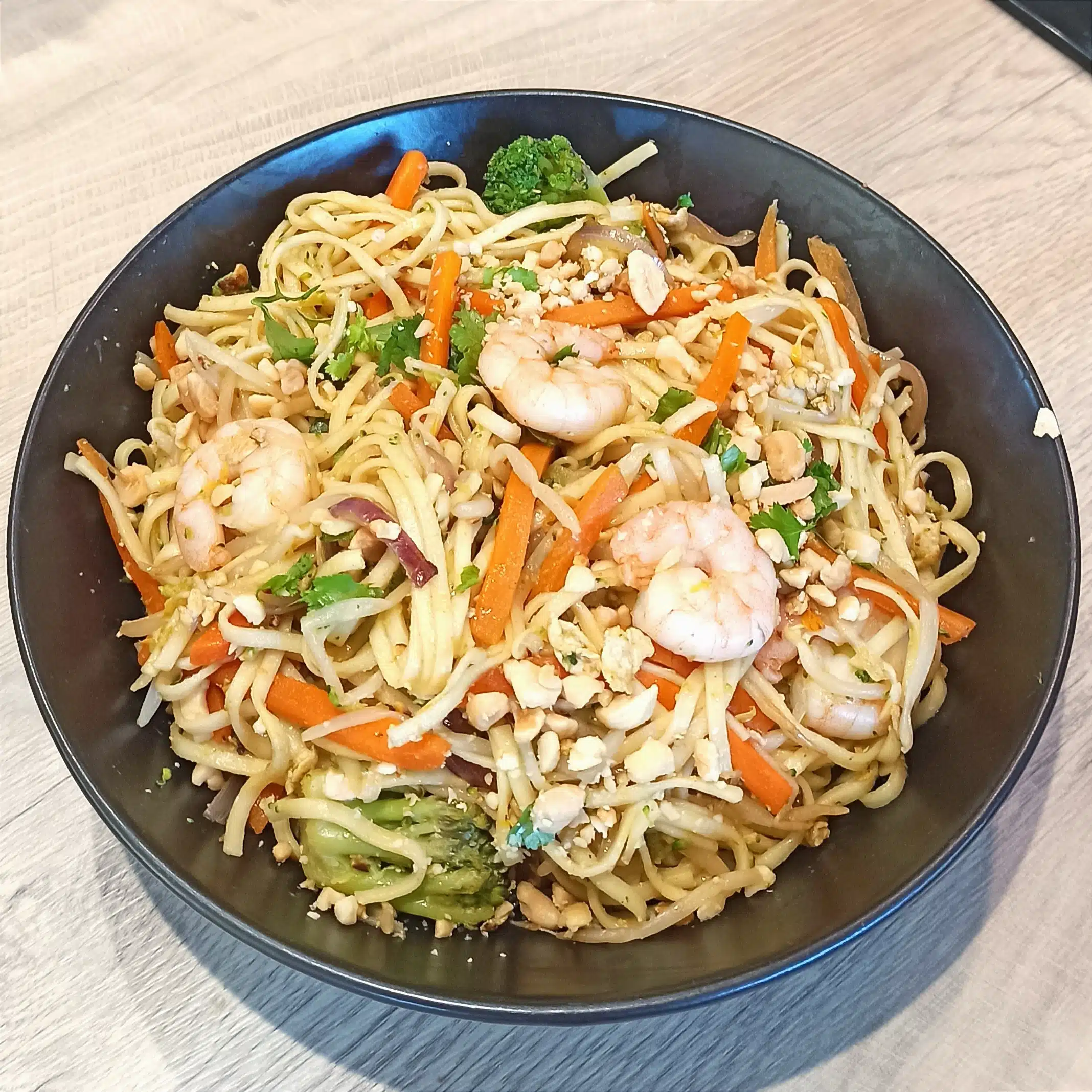 - Dans un wok bien chaud huilé, casser un œuf et le brouiller. Ajouter ensuite l'oignon et les carottes. Laisser cuir quelques minutes en remuant et ajouter les crevettes (les laisser cuir si elles ne le sont pas déjà). Insérer les haricots mungo, le brocolis cuit, les nouilles et les deux sauces. Continuer de mélanger.